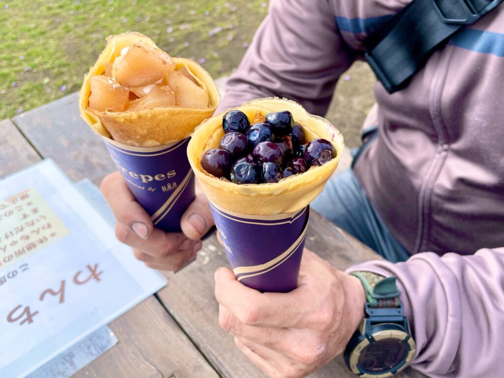 春の花を求めて出かけ、新玉ねぎピザとブルーベリークレープに出会う